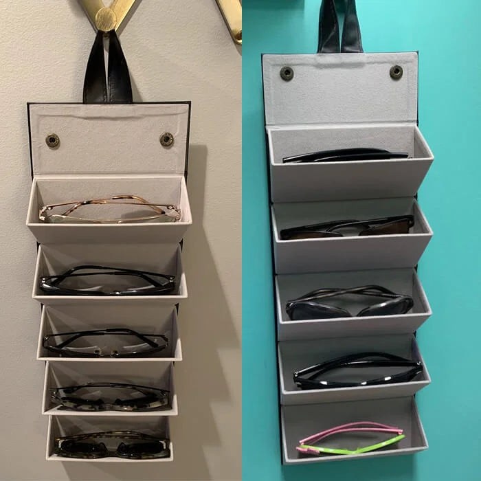 It can store 2-6 pairs sunglasses and glasses in one convenient and unique design case. You can hanging it in closet or put it on the dresser.